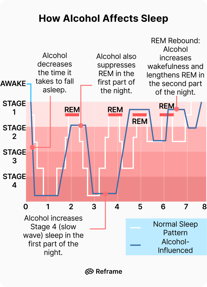 - 後半: 本来、メンタル回復や記憶の整理を行う「レム睡眠(REM)」が、細切れに分断(Fragmented)されている。 飲んで寝た翌朝に「妙な不安感」や「イライラ」があるのは、レム睡眠不足によって、前日の感情処理が完了していないからだ。